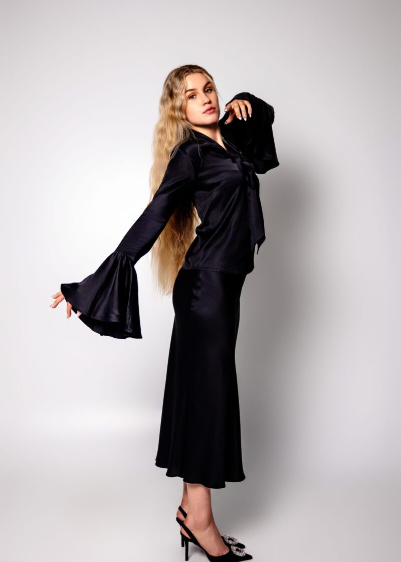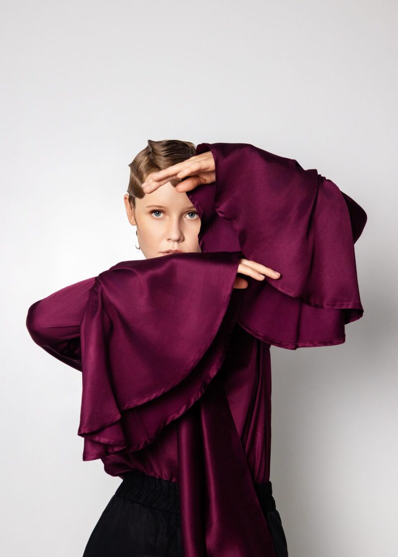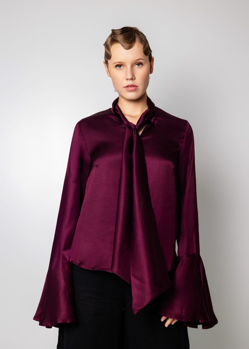 Bluzka z szeroką szarfą i rękawem ciętym z koła.