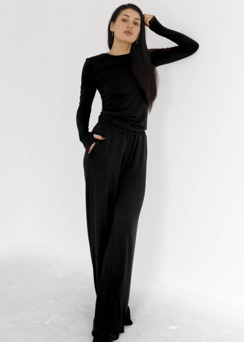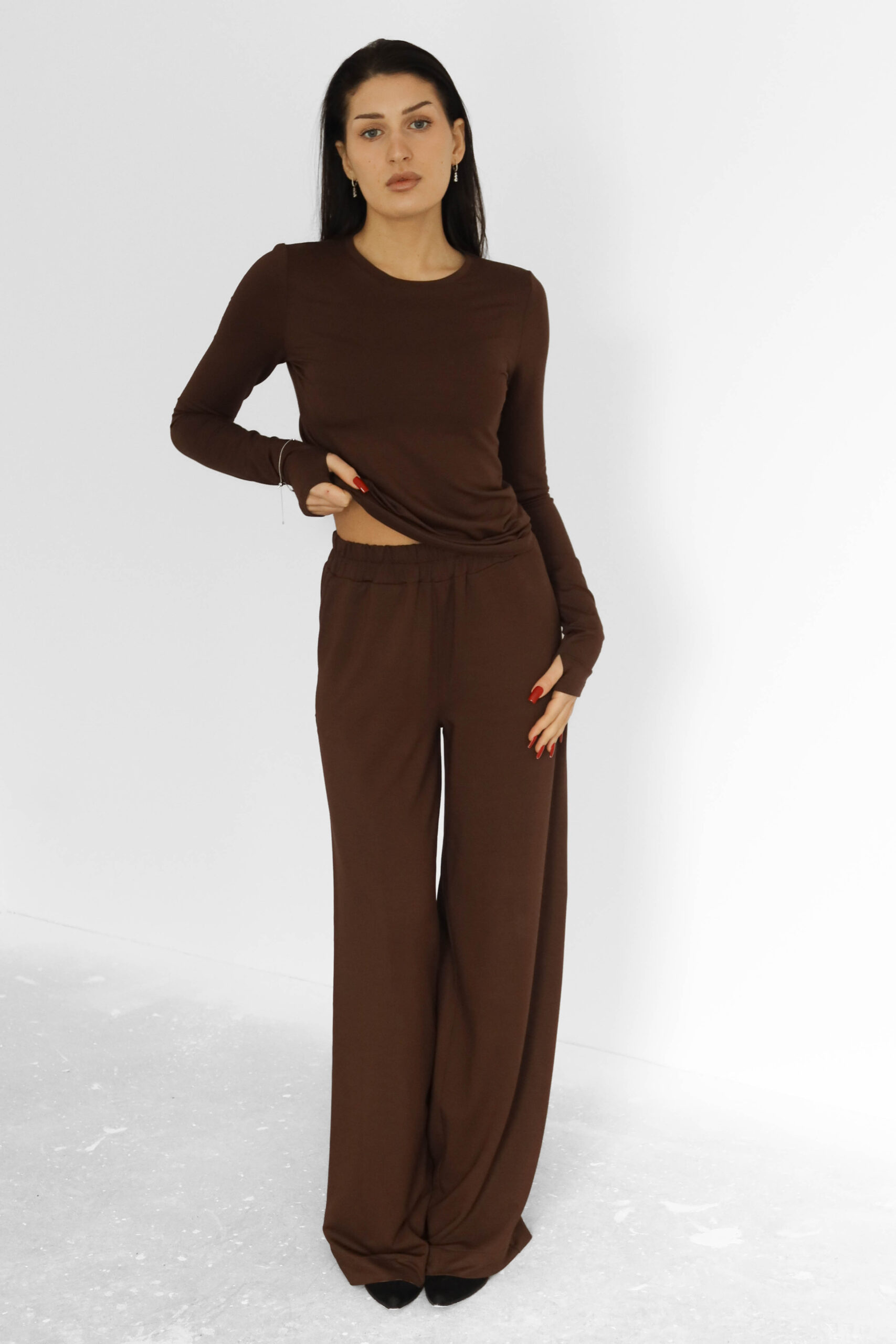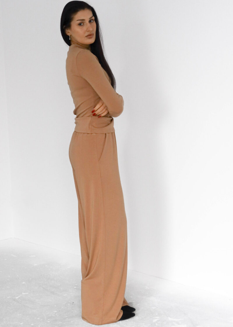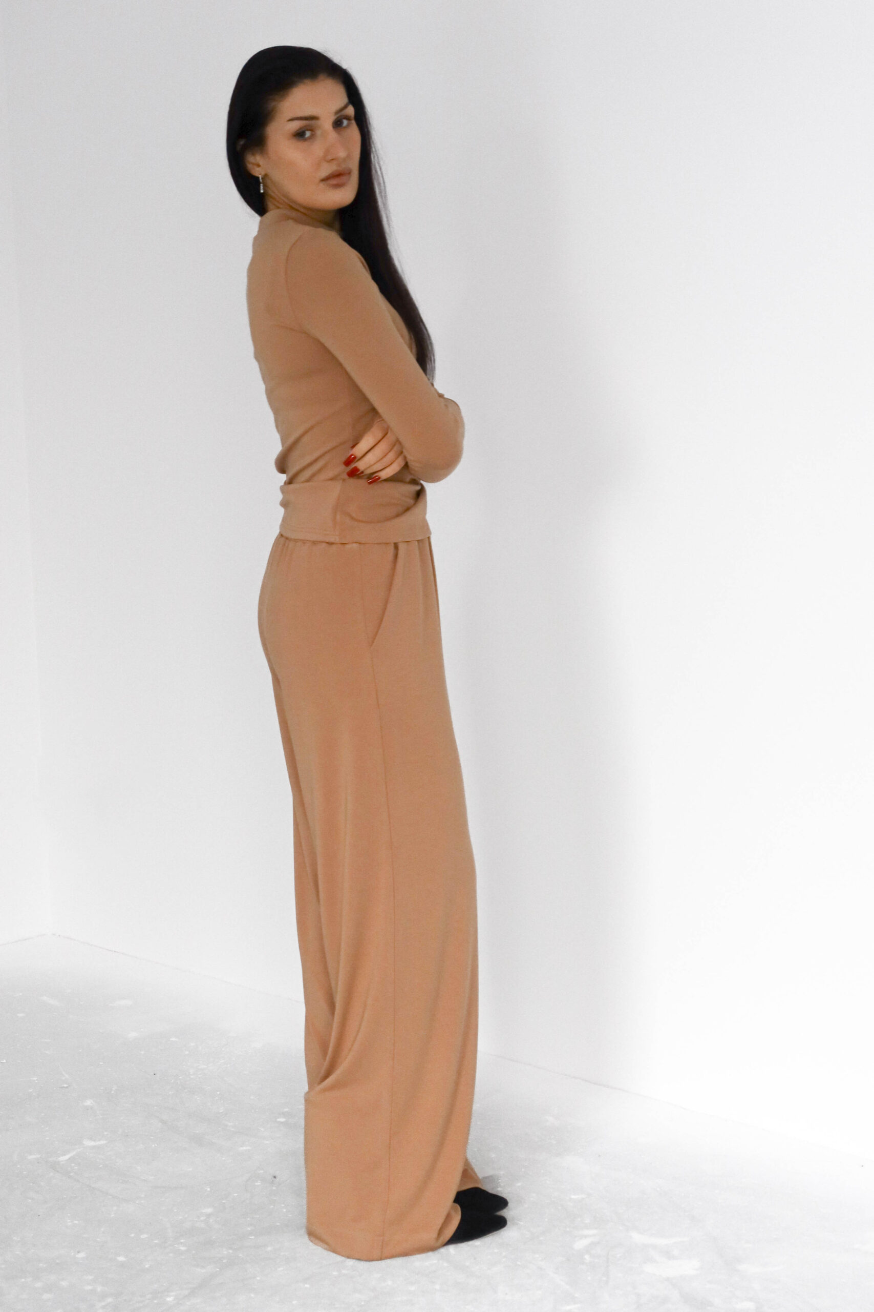 Szerokie spodnie dzianinowe na elastycznej talii. Prosty krój, swobodna forma.