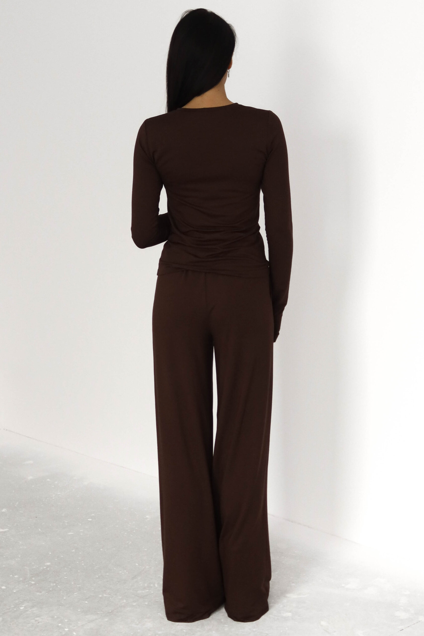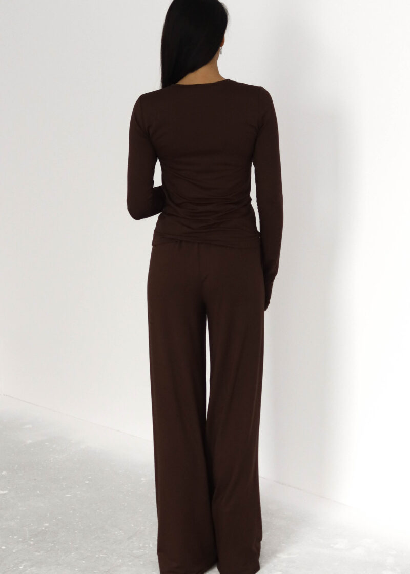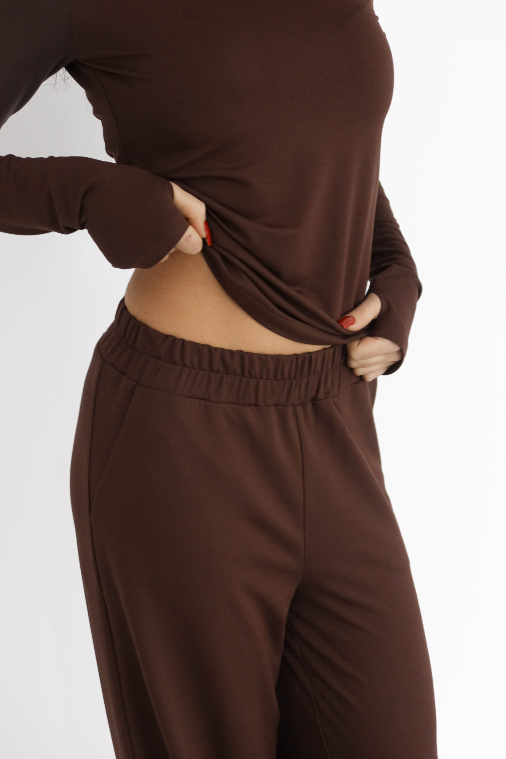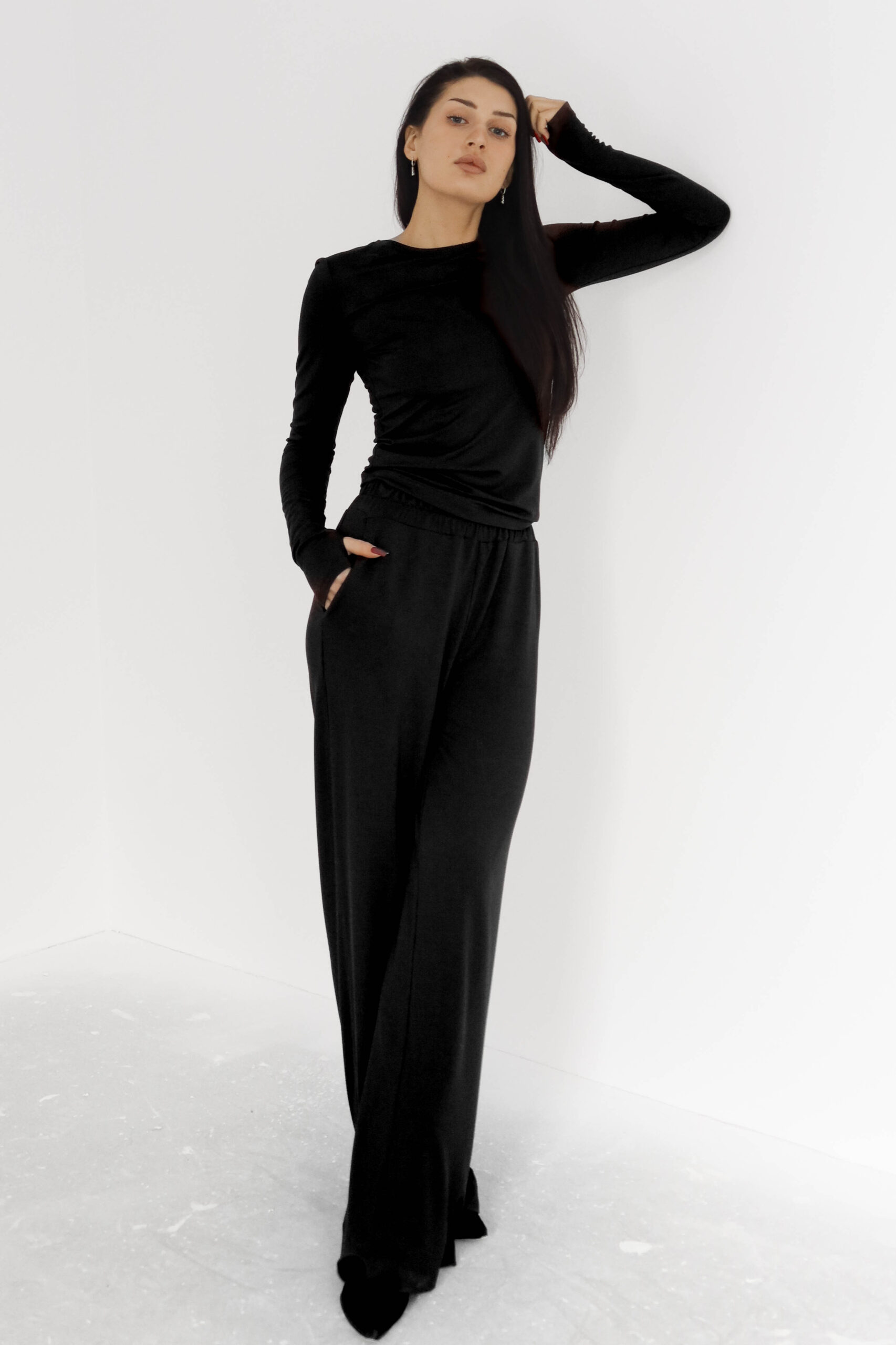 Szerokie spodnie dzianinowe na elastycznej talii. Prosty krój, swobodna forma.