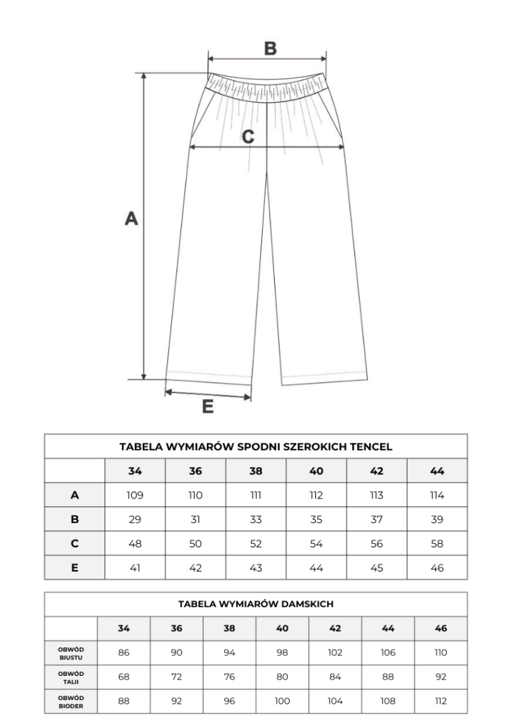 Wymiary dotyczą wielkości ubrań i są podane w centymetrach.